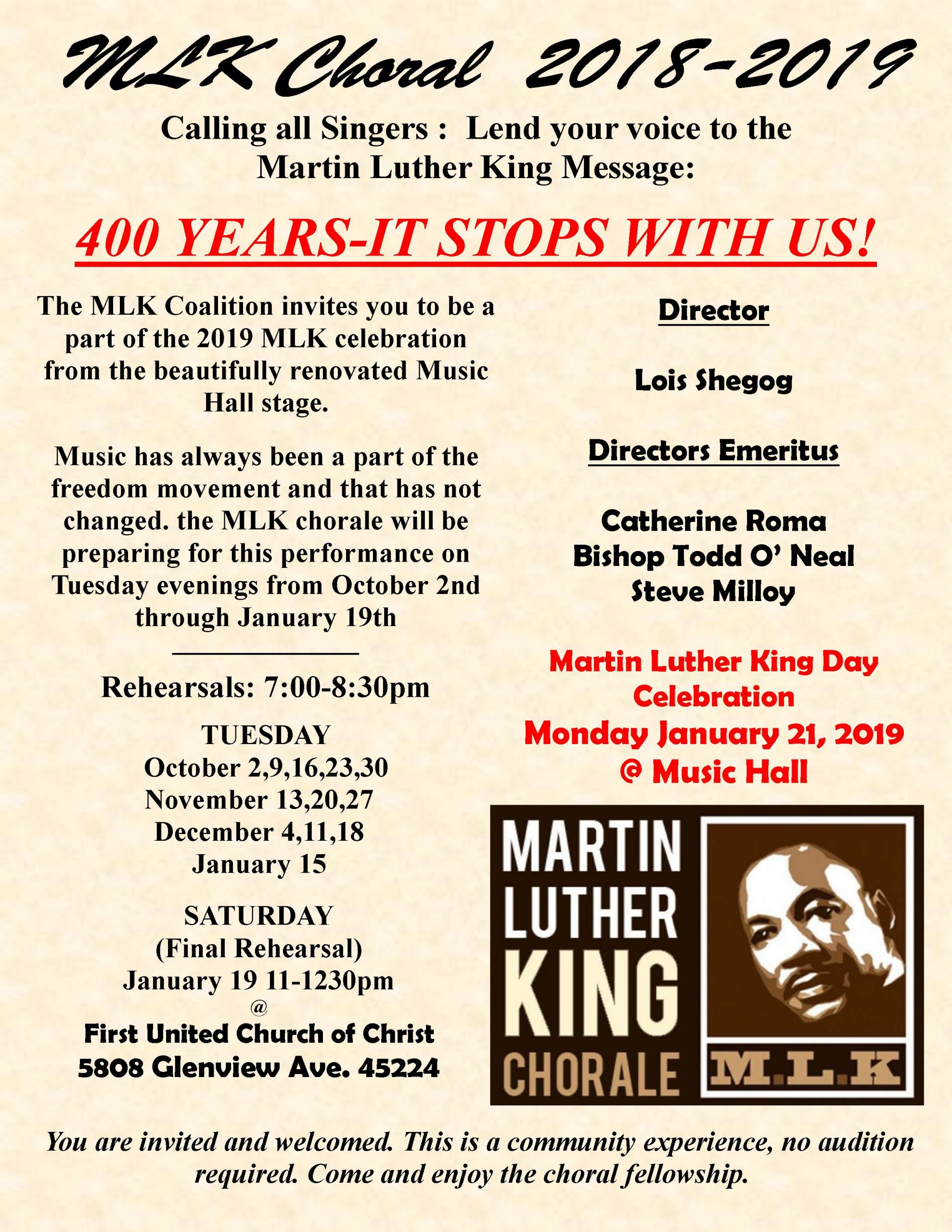 Continuing the Legacy of Dr. King Each year the Martin Luther King Jr. Coalition coordinates a series of events on Martin Luther King, Jr. Day. The Coalition’s 44th annual MLK Day celebration in Cincinnati is on Monday, January 20, 2020. Dedicated to keeping Dr. King’s legacy vibrant in Cincinnati, the MLK Coalition presents a series of events for 2020. Events will focus on his message, how others have carried on in his footsteps, and carrying his dream forward today! ...